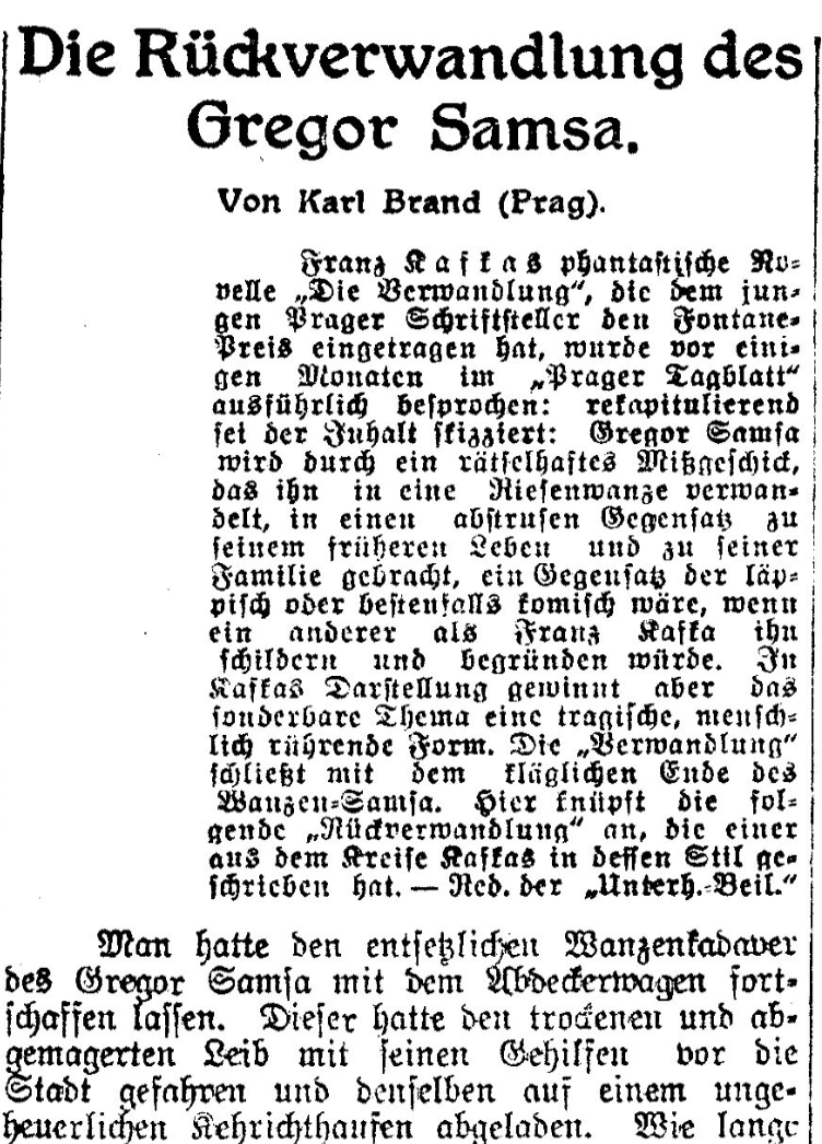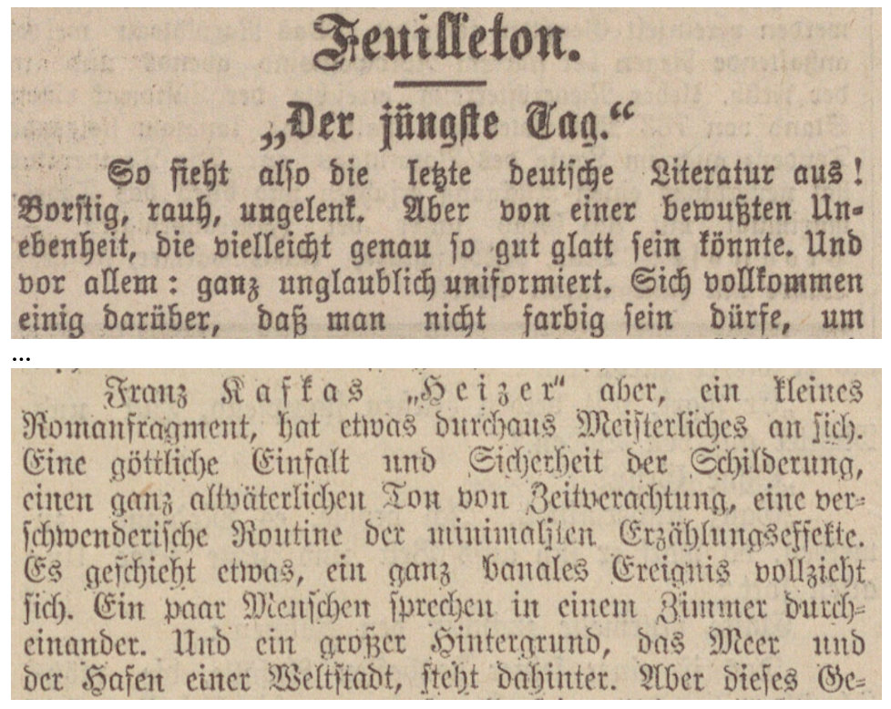 Die Besprechung, die Kafka hier meint, erschien am 22. September 1913 in der „Wiener Allgemeiner Zeitung“ im Artikel „Der jüngste Tag“ von keinem geringeren als dem Chefredakteur Ludwig Ullmann. Heute ist der Name den meisten unbekannt, doch sein Artikel hatte durchaus Gewicht. Ludwig Ullmann arbeitete 1910 bis 1911 für Karl Kraus und „Die Fackel“ und war seit 1912 Chefredakteur in der „Wiener Allgemeiner Zeitung“ und arbeitet auch als Kolumnist für die „Wiener Mittags-Zeitung“. Der studierte Germanist und Philosoph lobt Kafkas Text „Der Heizer“ als meisterlich und hebt ihn in seiner Qualität über die anderen Beiträge aus dem „Jüngsten Tag“. Ein Lob, das Franz Kafka sicherlich gefallen hat.