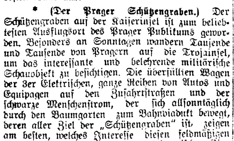 „(Der Prager Schützengraben.) Der Schützengraben auf der Kaiserinsel ist zum beliebtesten Ausflugsort des Prager Publikums geworden. Besonders an Sonntagen wandern Tausende und Tausende von Pragern auf die Trojainsel, um das interessante und belehrende militärische Schauobjekt zu besichtigen. Die überfüllten Wagen der 3er Elektrischen, ganze Reihen von Autos und Equipagen aus den Zufahrtstraßen und der schwarze Menschenstrom, der sich allsonntäglich durch den Baumgarten zum Bahnviadukt bewegt, deren aller Ziel der Schützengraben ist, zeigen am besten, welches Interesse diesen feldmäßigen Befestigungen mit all ihren kriegerischen Einrichtungen von der Bevölkerung entgegengebracht wird.