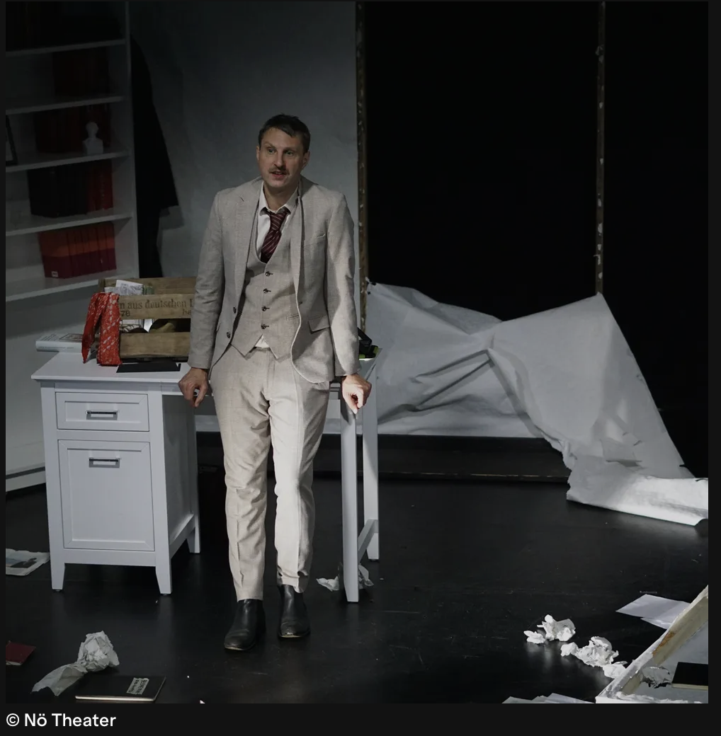 Im vollbesetzten und ausverkauften Orangerie-Theater im Kölner Volksgarten gastierte am 21. und 23. November 2025 das nö theater mit ihrer Inszenierung des Projektes „Kafka in falschen Händen„. In etwa neunzig durchweg fesselnden Minuten rekapituliert der Schauspieler Janosch Roloff in seiner Rolle als Max Brod seine Zeit und seine nicht immer leichte Freundschaft mit Franz Kafka und ebenso die literaturgeschichtliche Bedeutung seiner Weigerung, die Werke seines Freundes zu vernichten. Daneben schlüpft Janosch Roloff immer wieder in die Rolle eines auktorialen Erzählers, der zu Beginn über die Schwierigkeiten dieser szenischen Inszenierung spricht und zwischendurch auch den Kafkakult und manche Auswüchse im Kafkajahr 2024 aufs Korn nimmt.