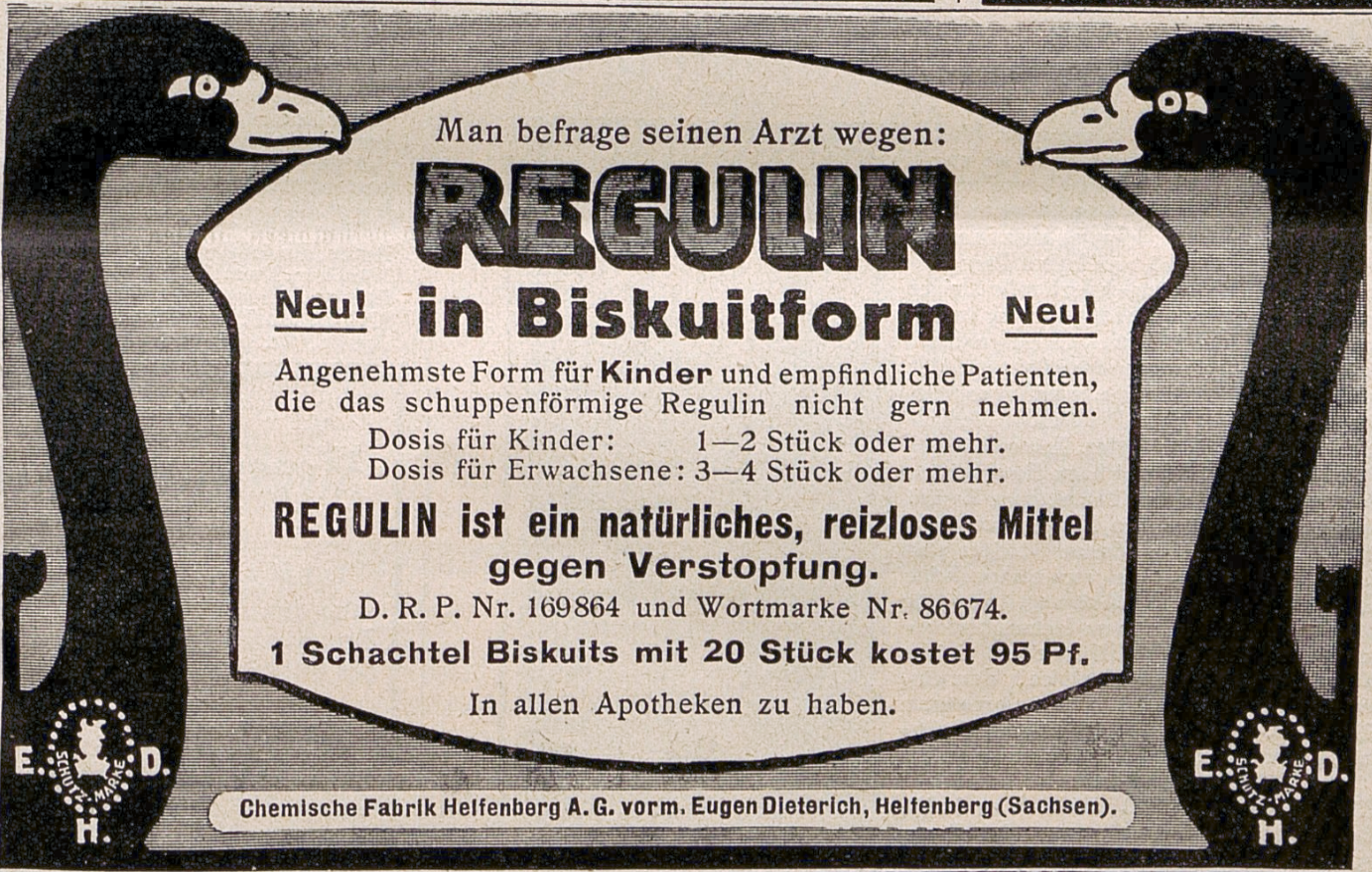 Der Zeichner Kubin empfiehlt als Abführmittel Regulin, eine zerstampfte Alge die im Darm aufquillt ihn zum Zittern bringt, also mechanisch wirkt zum Unterschied von der ungesunden chemischen Wirkung anderer Abführmittel, die bloß den Koth durchreißen ihn also an den Darmwänden hängen lassen.